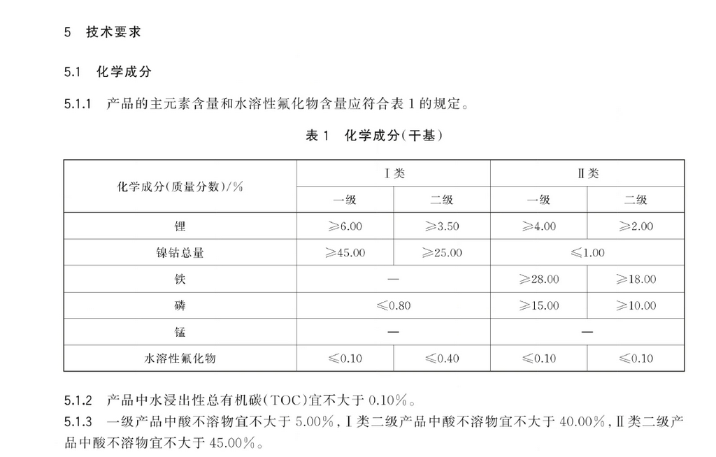 该文件中的电池黑粉进出口标准和2024年12月31日发布,预计于2025年7月1日实施的《锂离子电池用再生黑粉》,标准号为GB/T 45203-2024的文件一致,该文件由国家市场监督管理总局、国家标准化管理委员会发布:文件中将锂离子电池再生黑粉分别分为I类、Ⅱ类,和一级、二级,即分别对应三元电池黑粉、三元极片黑粉、铁锂极片黑粉及铁锂电池黑粉等,因此预计至放开后,这几类符合标准的黑粉都可实现自由进出口。