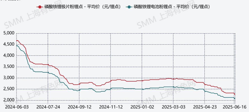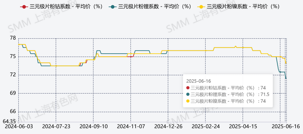 目前,中国占据全球锂电回收产能中至少70%以上的份额,拆解打粉、湿法回收产能均一应具求。并且,现在锂电回收端由于供应偏紧,主要定价权仍集中于上游卖方,因此预计黑粉进出口正式放开后,中国将成为锂离子黑粉的进口方。目前,随着多数盐类产品价格持续阴跌,且叠加打粉厂、湿法厂持续亏损,目前多数湿法企业选择减少外采频率,处于半停摆状态。截至2025年6月16日,三元极片粉镍钴系数为73-75%,锂系数为70-73%。三元电池粉镍钴系数为70-72%,锂系数为68-70%;铁锂极片粉锂点为2200-2350元/锂点。铁锂电池粉锂点为2000-2150元/锂点。