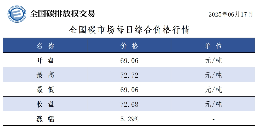 今日全国碳市场综合价格行情为: 开盘价69.06元/吨,最高价72.72元/吨,最低价69.06元/吨,收盘价72.68元/吨,收盘价较前一日上涨5.29%。