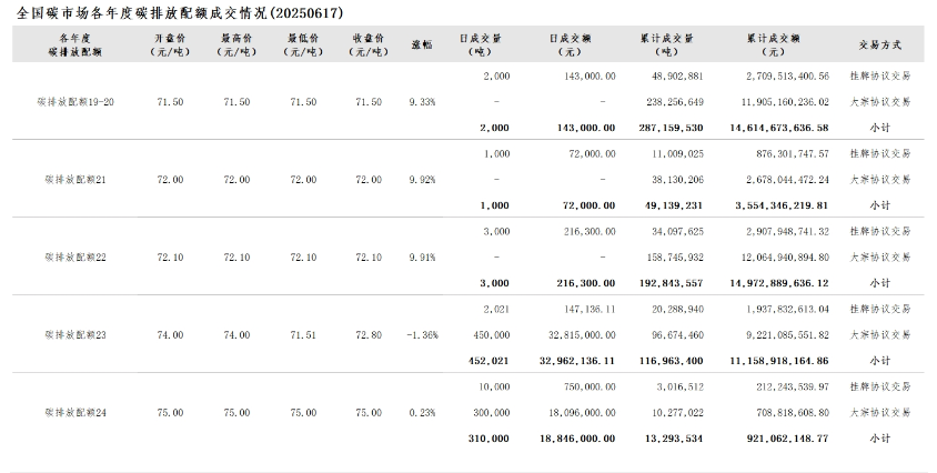 2025年1月1日至6月17日,全国碳市场碳排放配额成交量29,130,588吨,成交额2,189,162,702.63元。