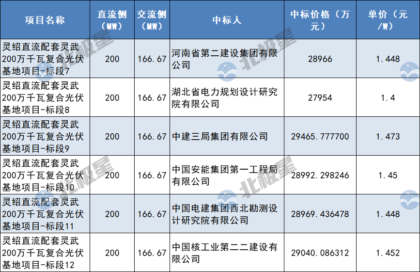 6月16日,宁夏电力国能灵武新能源有限公司灵绍直流配套灵武200万千瓦复合光伏基地项目EPC工程(七标段、八标段、九标段、十标段、十一标段、十二标段)公开招标中标结果公布,中标企业分别为河南省第二建设集团有限公司、湖北省电力规划设计研究院有限公司、中建三局集团有限公司、中国安能集团第一工程局有限公司、中国电建集团西北勘测设计研究院有限公司、中国核工业第二二建设有限公司。