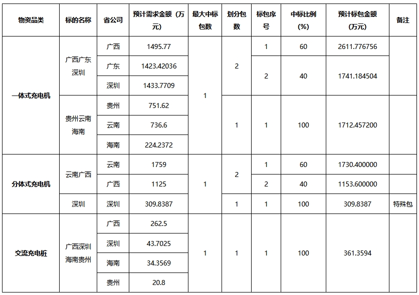2.1项目概述:按公司2025年集团物资集中采购工作计划,广东、广西、云南、贵州、海南电网公司和深圳供电局申报了一体式充电机、分体式充电机机、交流充电桩的有关需求的有关需求,根据年度采购计划组织开展本批次的框架招标工作。