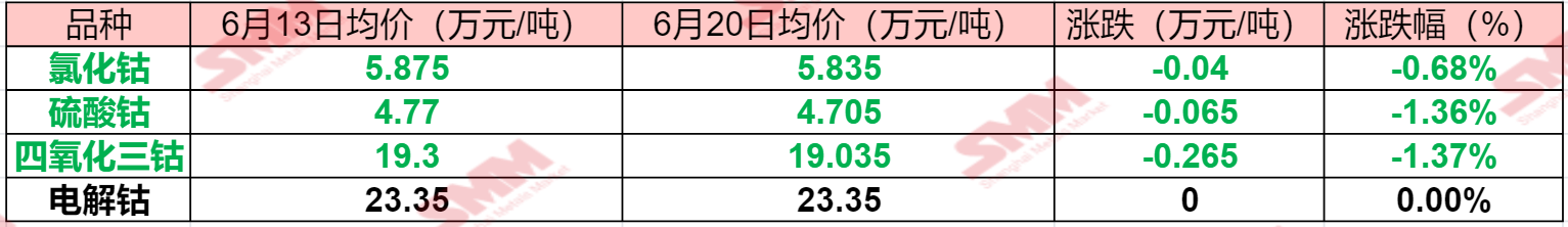 SMM 6月20日讯:随着刚果(金)对钴的禁令即将到期,市场“小作文”四起,不过下游多呈现观望态势,静待刚果(金)对钴新政策的出台,在此情况下,钴市场本周交易整体表现清淡,部分产品价格继续走低……SMM整理了本周钴系产品价格变动情况,具体如下: