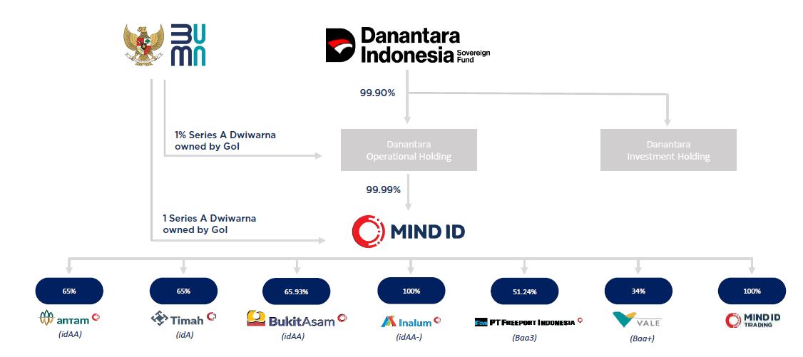 2025年3月22日,政府将其在公司中的所有B系列股份转让给 Danantara 的运营控股公司,作为对运营控股公司的额外资本投入。 • 此次转让后,Danantara 的运营控股公司持有 MIND ID 的99.99% B系列股份,而政府则通过 MSOE 持有1股A系列Dwiwarna股份。 • 根据2025年第15号政府条例,政府将继续通过持有A系列Dwiwarna股份对相关国有企业行使控制权。因此,MIND ID的最终控制权仍维持在政府手中。
