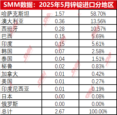 5月精炼锌进口前三的国家是哈萨克斯坦1.56万吨(58.7%),澳大利亚0.36万吨(13.56%),西班牙0.28万吨(10.57%)。从分国别数据上来看,西班牙、巴西增量明显,减量主要集中在哈萨克斯坦和澳大利亚。