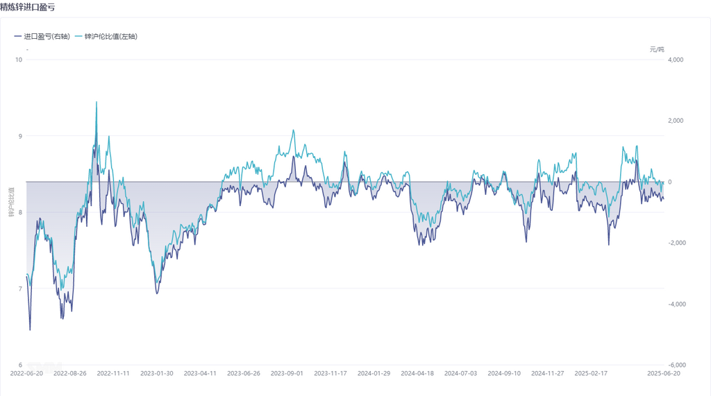 进入6月,宏观上中东地缘政治风险增加,美联储利率维持不变,但滞涨风险增加,关税政策暂无进展,宏观情绪偏空;基本面上海外LME库存持续下跌至不足13万吨,冶炼厂增产有限,国内随着进口矿的补充和国内矿山的产量释放,加工费继续上涨,冶炼厂原料充足下,生产积极性较高,而消费端除了因关税问题出口走弱外,国内消费进入季节性淡季,供增需弱下,社会库存开始累库,价格支撑较弱,外强内弱下,沪伦比值走低,进口窗口关闭,但前期锁价的货物仍有流入,预计进口量仍在2.5万吨左右。