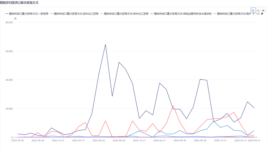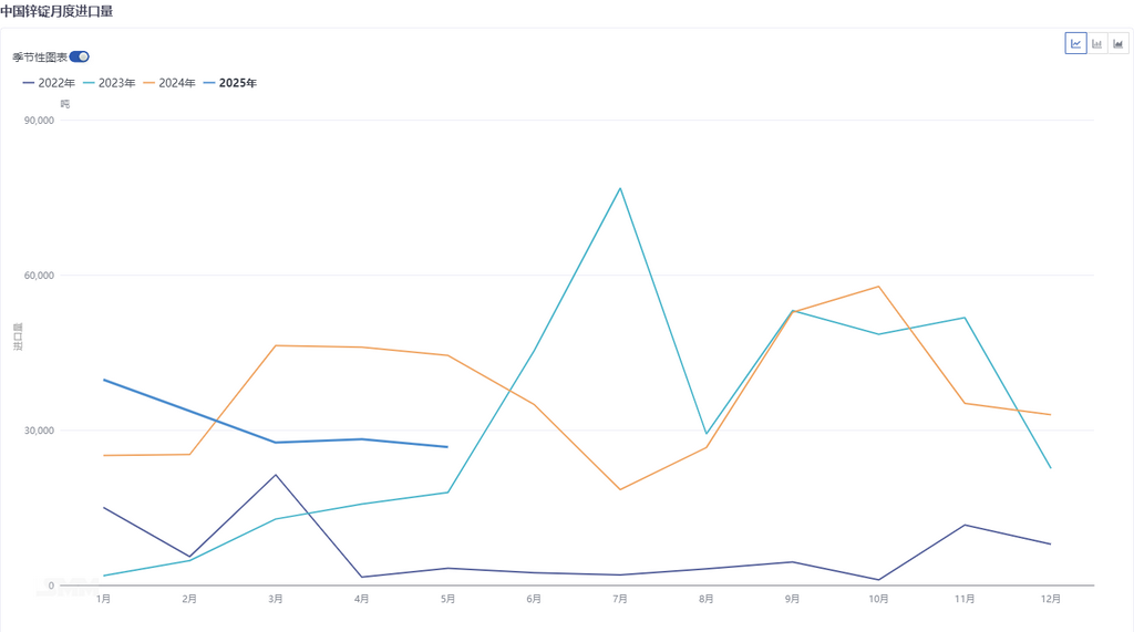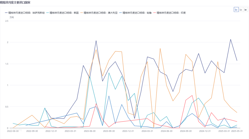 根据最新的海关数据显示,2025年5月精炼锌进口量2.67万吨,环比减少0.15万吨或环比下降5.36%,同比下降39.85%%。1-5月精炼锌累计进口量15.59万吨,累计同比下降16.66%。5月精炼锌出口0.14万吨,即5月精炼锌净进口2.53万吨。
