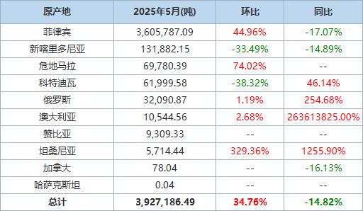 以下为根据中国海关总署官网数据整理的2025年5月镍矿砂及其精矿进口分项数据一览表:
