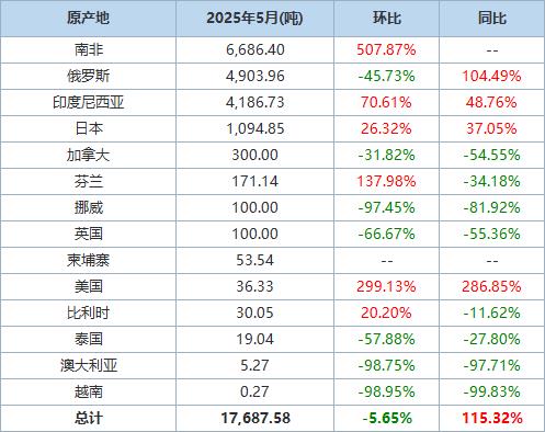 以下为根据中国海关总署官网数据整理的2025年5月未锻压镍进口分项数据一览表:
