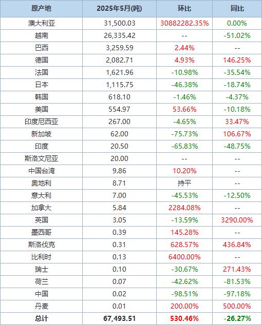 以下为根据中国海关总署官网数据整理的2025年5月氧化铝进口分项数据一览表: