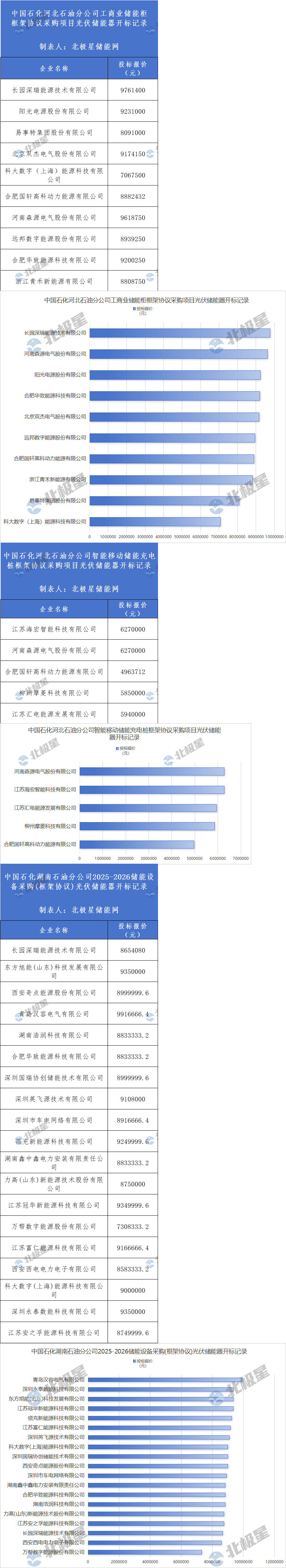 三大项目包括中国石化河北石油分公司的工商业储能柜(以下简称“河北工商储项目”)和智能移动储能充电桩框架协议采购项目(以下简称“河北移动储能充电桩项目”),以及中国石化湖南石油分公司2025-2026年储能设备采购框架协议采购项目(以下简称“湖南项目”)。