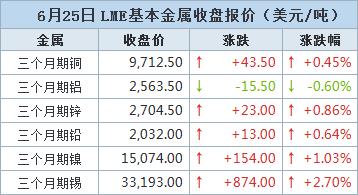 伦敦时间6月25日17:00(北京时间6月26日00:00),LME三个月期铜上涨43.5美元,或0.45%,收报每吨9,712.5美元。