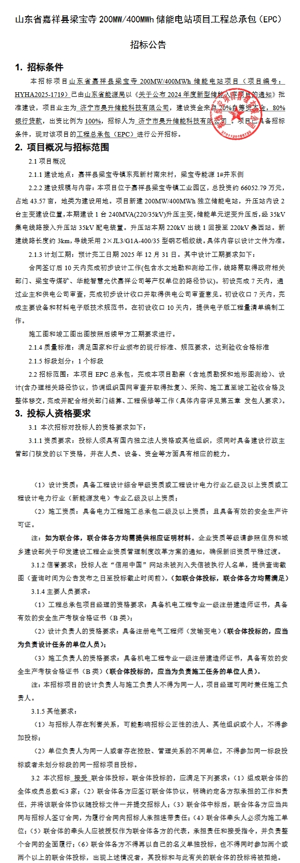 6月25日,济宁市昊升储能科技有限公司发布山东省嘉祥县梁宝寺200MW/400MWh储能电站项目工程总承包(EPC)招标公告。项目位于山东省济宁市嘉祥县,项目新建 200MW/400MWh独立储能电站,升压站内设2台主变建设位置,本期建设1台240MVA(220/35kV)升压主变,储能单元逆变升压后,经 35kV集电线路接入升压站 35kV 配电装置。预计完工日期2025年12月31日。