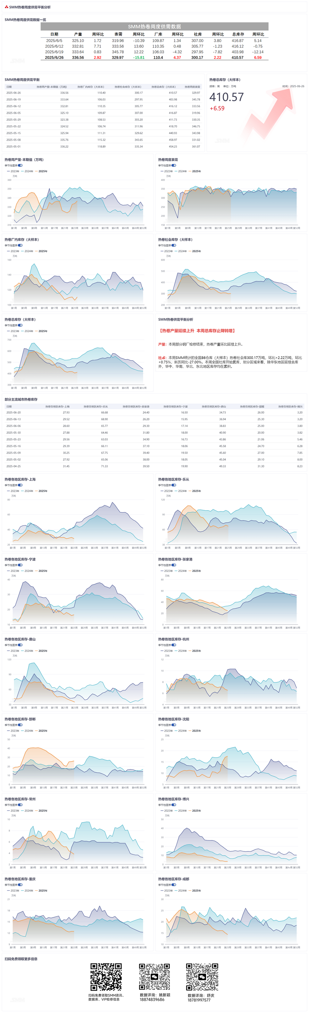 本周SMM统计的全国86仓库(大样本)热卷社会库300.17万吨,环比+2.22万吨,环比+0.75%,新历同比-27.00%。本周全国社库开始累库,划分区域来看,除华东地区延续去库外,华中、华南、华北、东北地区库存均在累积。【SMM钢铁】
