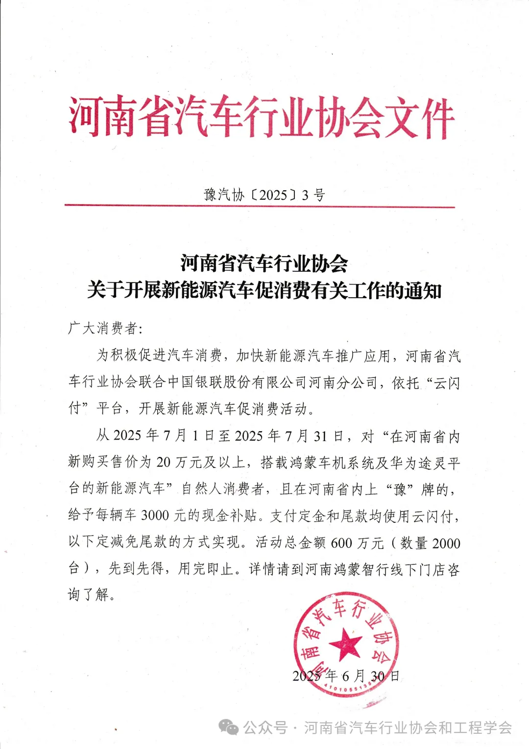 河南省汽车行业协会6月30日印发《关于开展新能源汽车促消费有关工作的通知》显示,从2025年7月1日至2025年7月31日,对“在河南省内新购买售价为20万元及以上,搭载鸿蒙车机系统及华为途灵平台的新能源汽车”自然人消费者,且在河南省内上“豫”牌的,给予每辆车3000元的现金补贴。支付定金和尾款均使用云闪付,以下定减免尾款的方式实现。活动总金额600万元(数量2000台),先到先得,用完即止。
