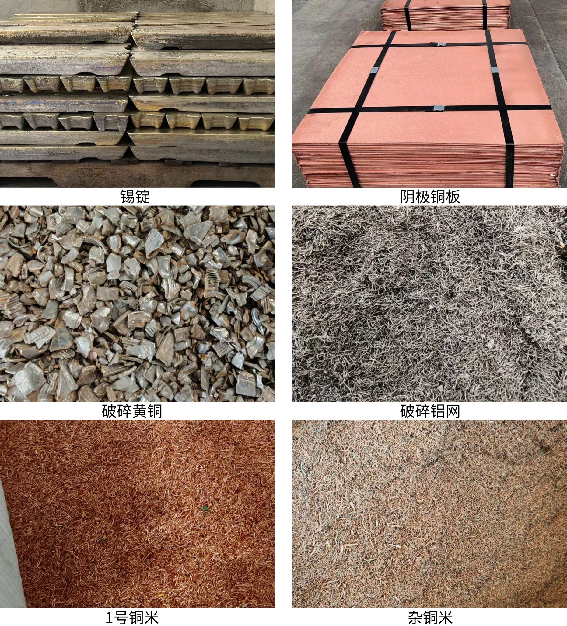 产出主要有:阴极铜、锡锭、银珠、铝、镍、不锈钢、铁、塑料、铜化合物等。