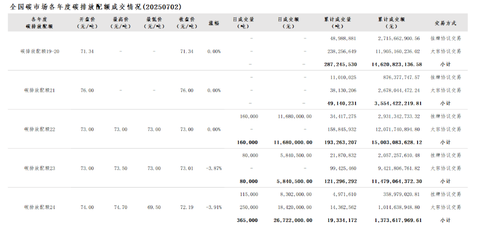 2025年1月1日至7月2日,全国碳市场碳排放配额成交量40,010,768吨,成交额2,998,284,222.91元。