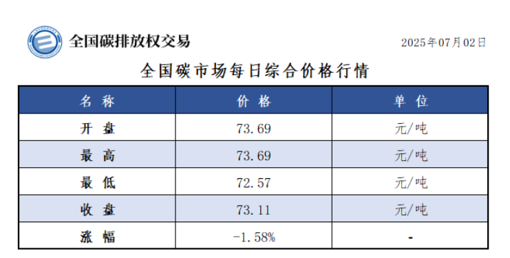 今日全国碳市场综合价格行情为: 开盘价73.69元/吨,最高价73.69元/吨,最低价72.57元/吨,收盘价73.11元/吨,收盘价较前一日下跌1.58%。