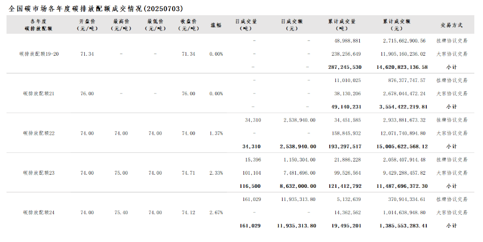 2025年1月1日至7月3日,全国碳市场碳排放配额成交量40,322,607吨,成交额3,021,390,476.71元。