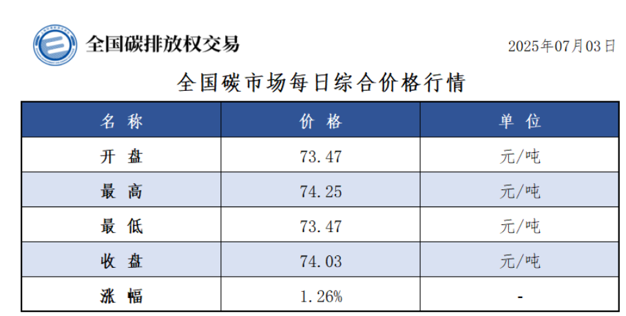 今日全国碳市场综合价格行情为: 开盘价73.47元/吨,最高价74.25元/吨,最低价73.47元/吨,收盘价74.03元/吨,收盘价较前一日上涨1.26%。