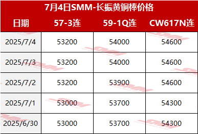 【SMM价格】2025年7月4日长振黄铜棒价格
