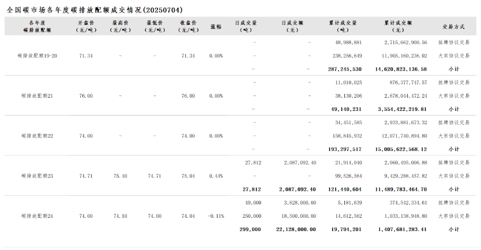 2025年1月1日至7月4日,全国碳市场碳排放配额成交量40,649,419吨,成交额3,045,605,569.11元。