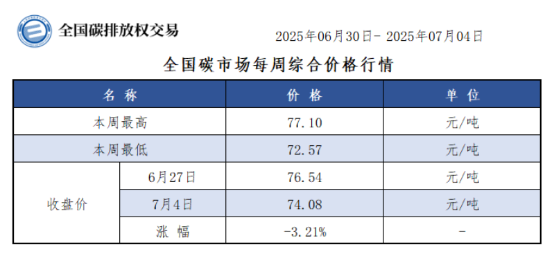 本周全国碳市场综合价格行情为:最高价77.10元/吨,最低价72.57元/吨,收盘价较上周五下跌3.21%。