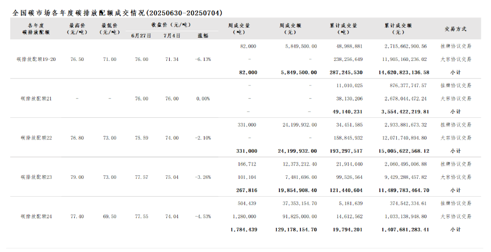2025年1月1日至7月4日,全国碳市场碳排放配额成交量40,649,419吨,成交额3,045,605,569.11元。