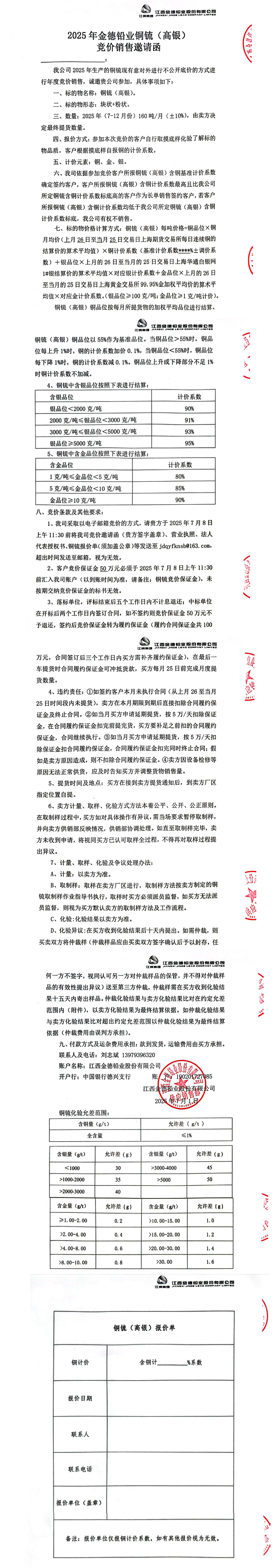 近期,江西金德铅业股份有限公司发布2025年下半年铜锍(高银)竞价销售邀请函,公告表示,公司2025年生产的铜锍现有意对外进行不公开底价的方式进行年度竞价销售,数量为2025年(7-12月份)160吨/月(±10%),由卖方决定最终提货数量。提货时间及地点方面,买方在接到卖方提货通知后,到卖方厂区指定位置自提。