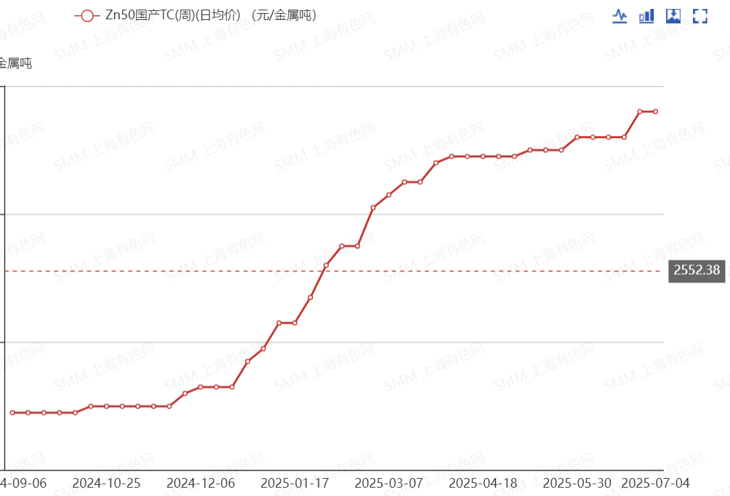 其中锌加工费方面,据SMM现货报价显示,自进入2025年以来,国产锌精矿周度加工费自进入2024年10月以来接连上涨,截至6月27日,Zn50国产TC(周)均价报3800元/金属吨,较2024年年底的1850元/金属吨上涨1950元/吨,涨幅高达105.41%。
