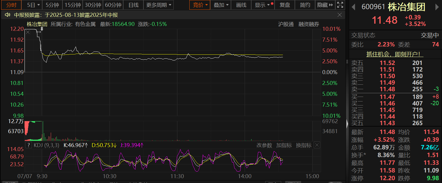 受业绩大幅预增的消息刺激,今日早间开盘之后,株冶集团早间开盘之后一度拉升涨停,盘中最高冲至11.77元/股,刷新2024年5月以来的新高,不过随后涨停板打开,截至14:34分,株冶集团以3.52%的涨幅报11.48元/股。