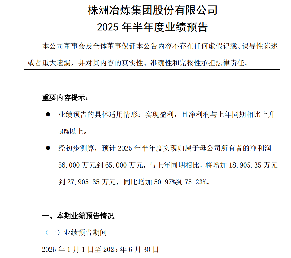 SMM 7月7日讯:近日,株冶集团发布2025年上半年业绩预告,公告显示,株冶集团上半年净利润大幅预增,公司经初步测算,预计2025 年半年度实现归属于母公司所有者的净利润5.6亿元~6.5亿元,与上年同期相比,将增加1.89亿元到2.79亿元,同比增加 50.97%到75.23%;预计 2025 年半年度实现归属于母公司所有者的扣除非经常性损益的净利润5.7万元到6.6亿元,与上年同期相比,将增加2.55亿元到3.45亿元,同比增加 80.97%到109.55%。