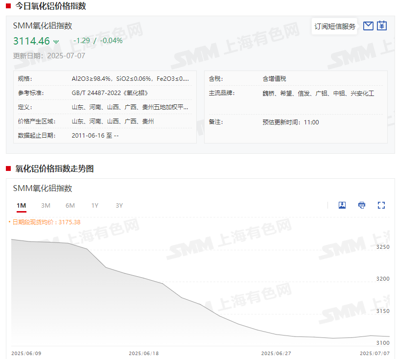 氧化铝价格方面,截至7月7日,SMM氧化铝指数报3114.46元/吨。据SMM最新调研显示,上周氧化铝运行产能下降34万吨/年至8863万吨/年,短期内,氧化铝运行产能预计维持高位,仅有少数厂家进行常规检修,现货市场供应维持相对宽松状态,给予氧化铝现货价格顶部压力。但近期氧化铝期货拉涨,氧化铝期现无风险套利窗口接近开启状态,期现商询盘相对积极,现货货源阶段性收紧,持货商报价上调,短期内,氧化铝现货价格或出现小幅回升。但后续走势仍需关注供需基本面的变动,期货价格的变化以及交仓需求的变化。