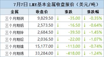 伦敦时间7月7日17:00(北京时间7月8日00:00), LME三个月期铜下跌35美元,或0.35%,收报每吨9,829.5美元。技术面来看,该合约的支撑位在21日移动均线9,767.6美元。
