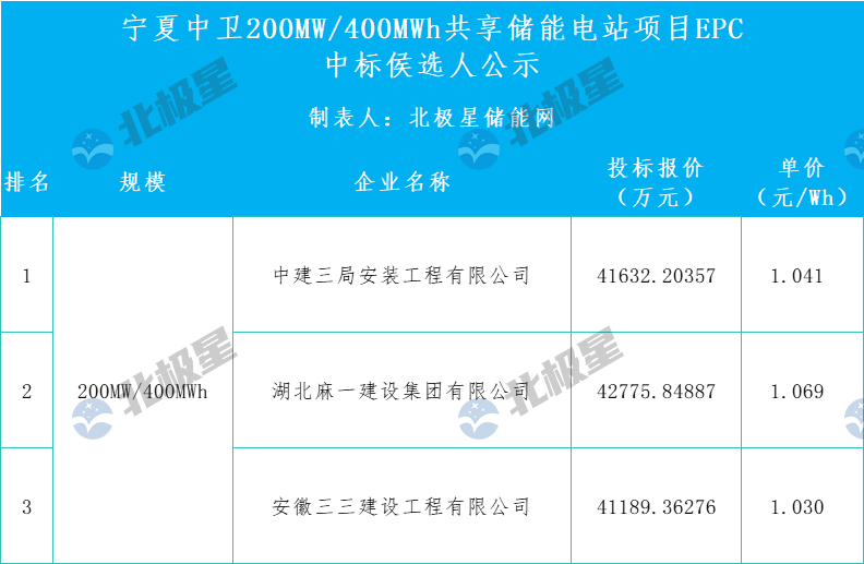 北极星储能网获悉,7月4日,益能中卫200MW/400MWh共享储能电站项目中标候选人公示。