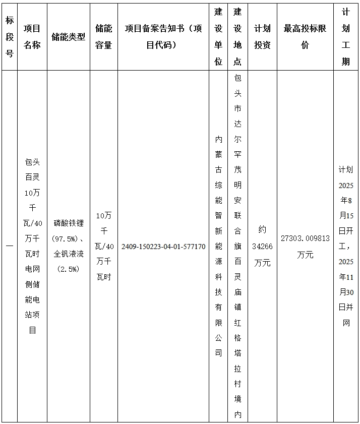 依据《中华人民共和国招标投标法》、《中华人民共和国招标投标法实施条例》的规定,遵循公开、公平、公正和诚实信用原则,内蒙古蒙电招标有限公司受内蒙古综能智新能源科技有限公司的委托,对包头百灵10万千瓦/40万千瓦时电网侧储能电站项目EPC总承包进行公开招标,现公告如下:
