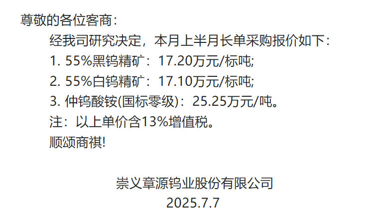据崇义章源钨业7月7日消息:崇义章源钨业股份有限公司7月上半月长单采购报价如下: 1. 55%黑钨精矿:17.2万元/标吨,较上轮报价上调0.2万元/标吨;2. 55%白钨精矿:17.1万元/标吨,较上轮报价上调0.2万元/标吨;3. 仲钨酸铵(国标零级):25.25万元/吨,较上轮报价上调0.15万元/吨。