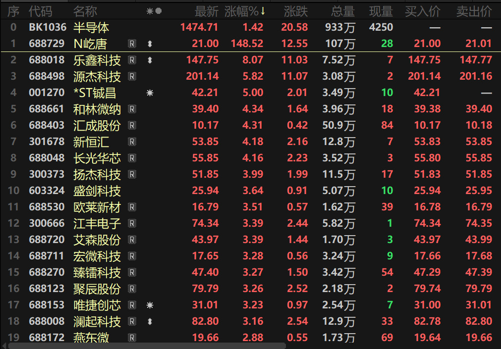 其余个股方面,乐鑫科技一度涨7.74%,新恒汇涨6.11%,源杰科技、汇成股份等多股纷纷跟涨。