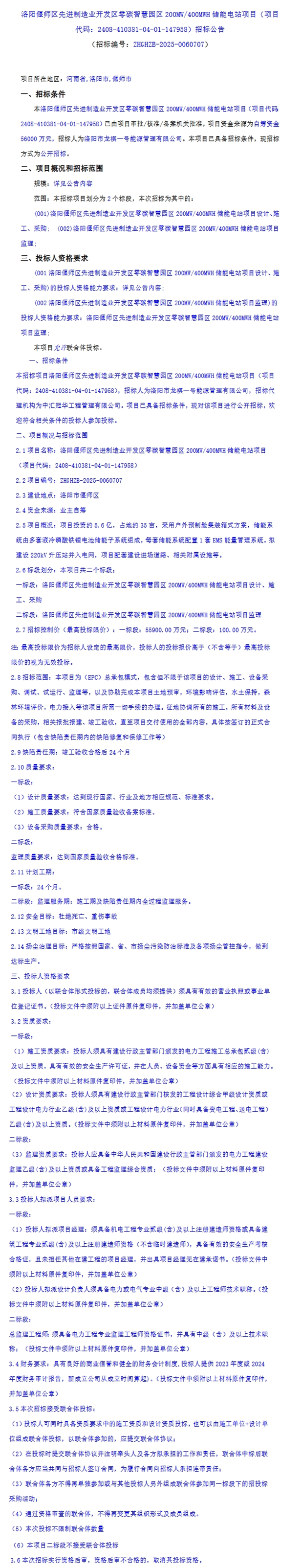 7月7日,洛阳市龙祺一号能源管理有限公司发布洛阳偃师区先进制造业开发区零碳智慧园区200MW/400MWh储能电站项目招标公告。项目位于河南省洛阳市偃师市,一标段招EPC总承包,最高投标限价55900万元,折合单价1.398元/Wh,二标段招监理。