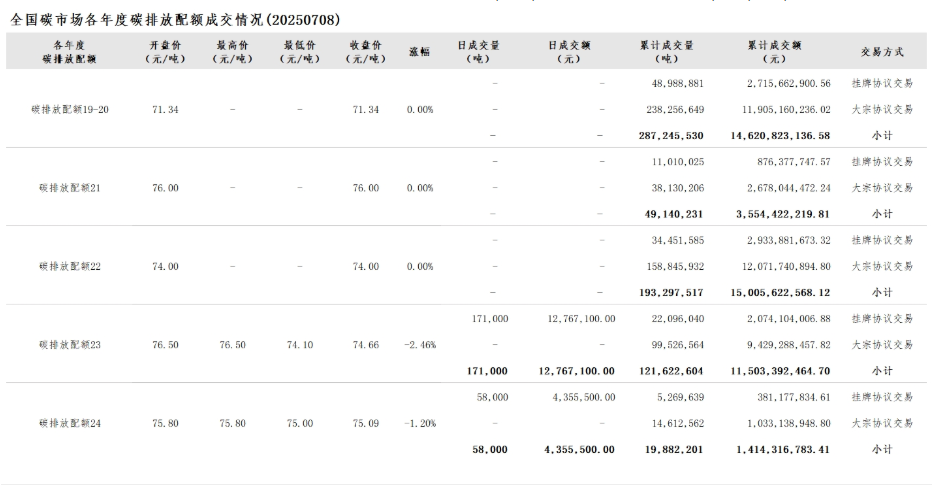 2025年1月1日至7月8日,全国碳市场碳排放配额成交量40,919,419吨,成交额3,065,850,069.11元。