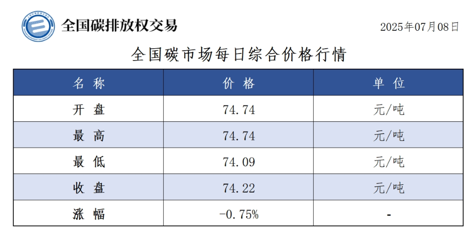 今日全国碳市场综合价格行情为: 开盘价74.74元/吨,最高价74.74元/吨,最低价74.09元/吨,收盘价74.22元/吨,收盘价较前一日下跌0.75%。