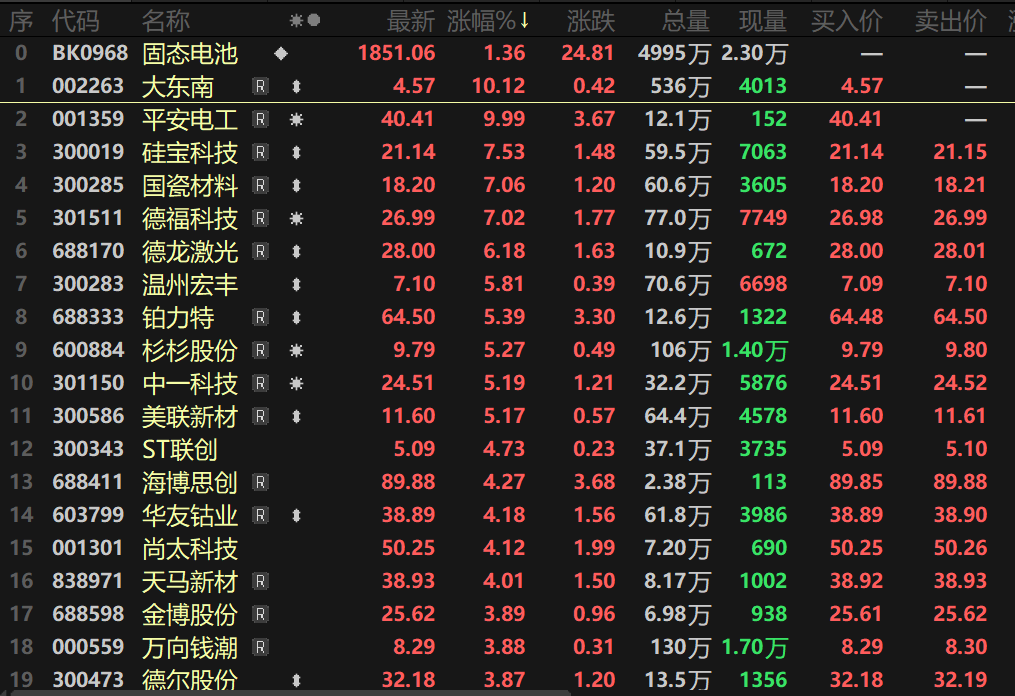 SMM 7月8日讯:固态电池板块今日继续走高,指数盘中涨超1%,截至日间收盘,固态电池板块以1.36%的涨幅报1851.06。个股方面,大东南、平安电工一同涨停,硅宝科技、国瓷材料、德福科技、德龙激光、温州宏丰等多股纷纷跟涨。