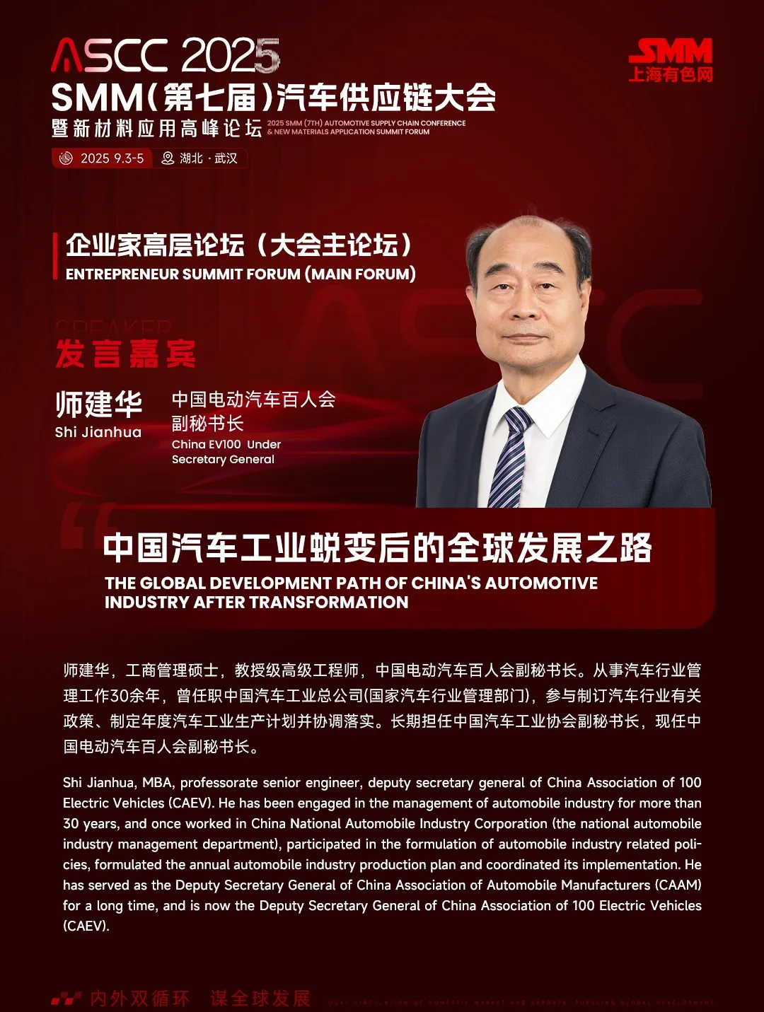 当下中国汽车工业如何向全球布局发展?海外内的发展趋势是怎样的?如何看待海外布局?我们有幸邀请到中国电动汽车百人会副秘书长师建华出席2025年9月3日,在武汉举办的ASCC2025SMM汽车供应链大会暨新材料应用高峰论坛。师建华将围绕这些问题对“中国汽车工业蜕变后的全球发展之路”展开深度剖析。