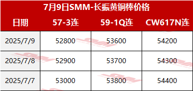 【SMM价格】2025年7月9日长振黄铜棒价格