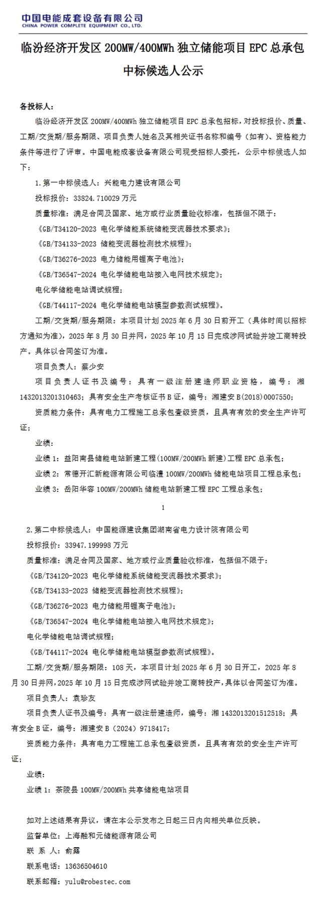 北极星储能网获悉,7月8日,临汾经济开发区200MW/400MWh独立储能项目EPC总承包招标中标候选人公示。