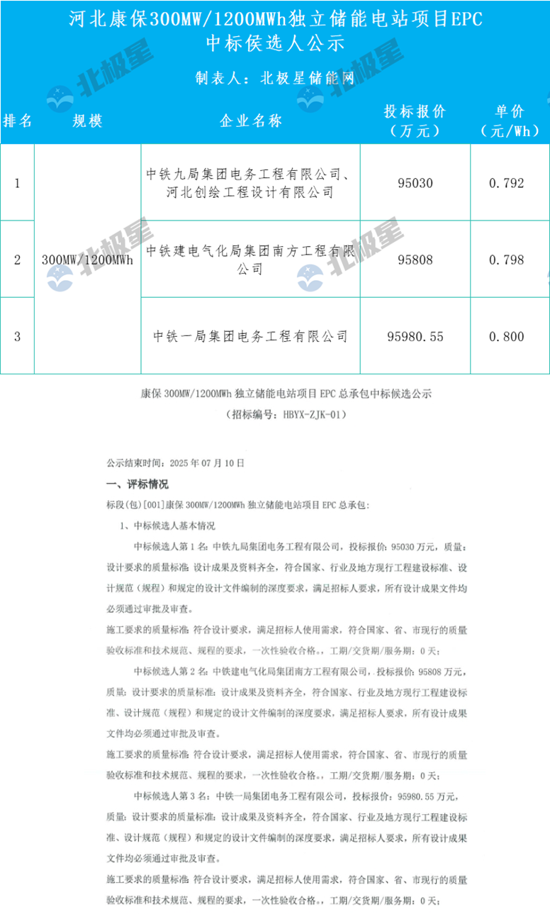 中铁九局集团电务工程有限公司位列第一中标候选人,投标报价95030万元,折合单价0.792元/Wh;