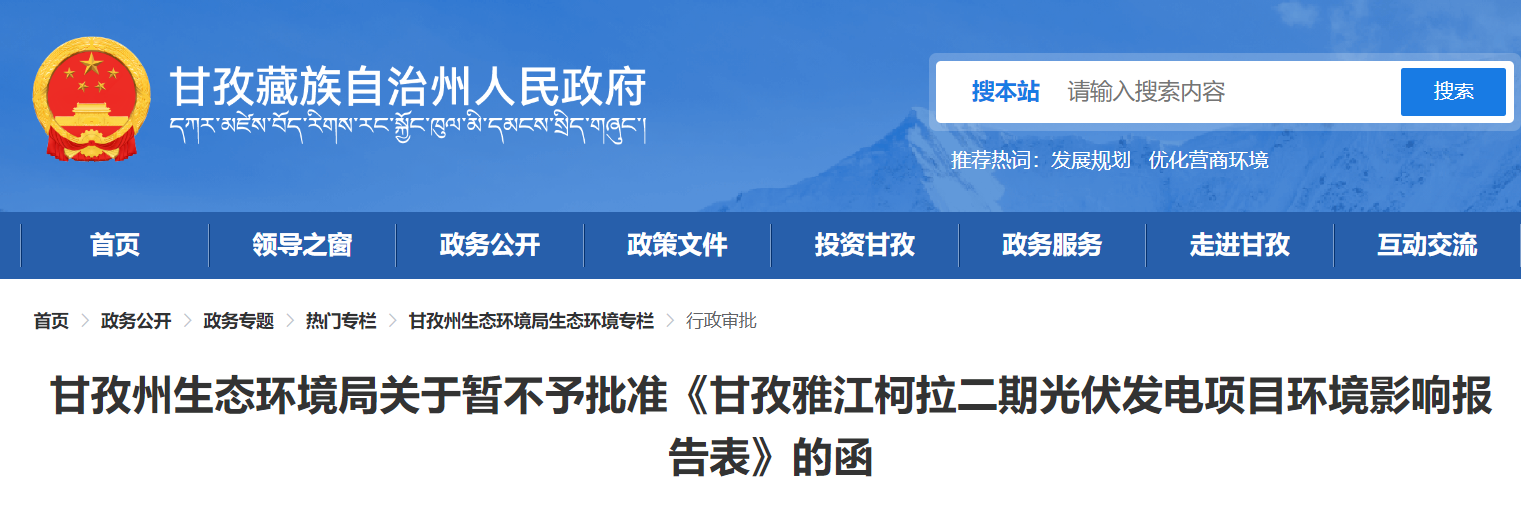 甘孜雅江柯拉二期光伏发电项目报批企业为国投电力旗下雅砻江流域水电开发有限公司,不予批准原因:《报告表》主要存在本项目经批准临时占用草原面积和实际调查评价面积不符等问题,现阶段《报告表》提出的评价结论暂不足以支撑本工程环境可行性。