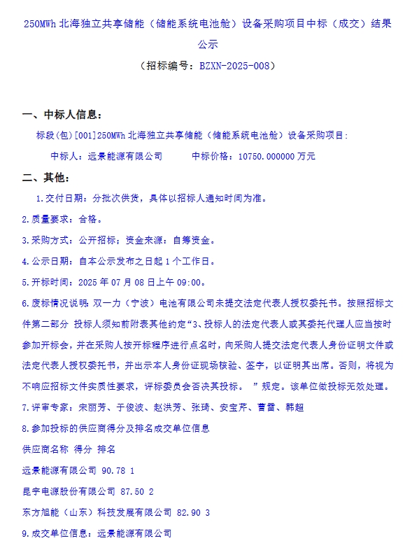 北极星储能网获悉,7月8日,250MWh北海独立共享储能(储能系统电池舱)设备采购项目中标(成交)结果公示。远景能源有限公司以10750万元中标该项目,折合单价0.43元/Wh。昆宇电源股份有限公司和东方旭能(山东)科技发展有限公司位列第二、第三中标候选人。