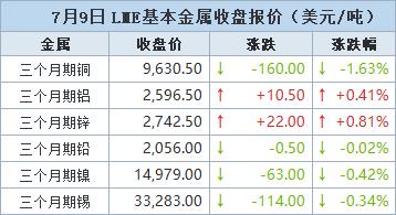 伦敦时间7月9日17:00(北京时间7月10日00:00),LME三个月期铜下跌160美元,或1.63%,收报每吨9,630.5美元。