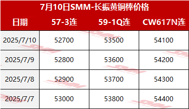 【SMM价格】2025年7月10日长振黄铜棒价格